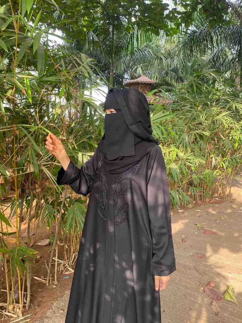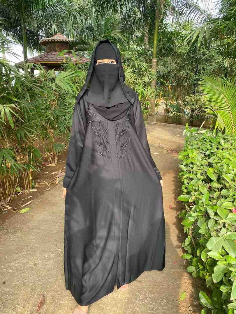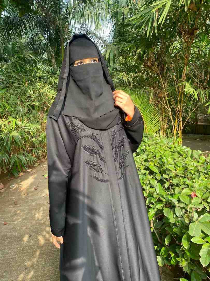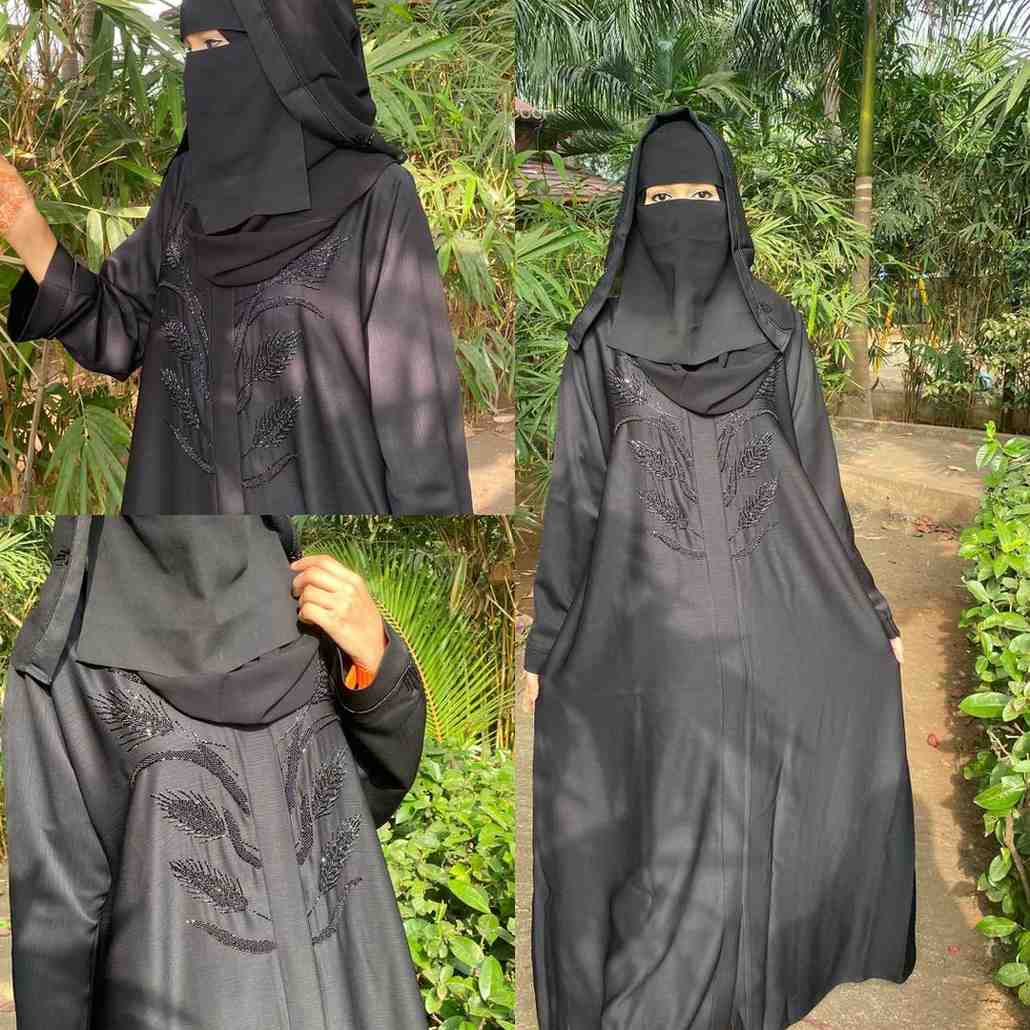 The abaya is transformed into a canvas for artistry, with intricate handwork design forming delicate butterfly motifs, brought to life with kat dana, poth, and sparkling crystals. Each butterfly is meticulously highlighted with a special rainbow pencil, creating a subtle iridescence that mimics the gentle play of light on a butterfly’s wings.