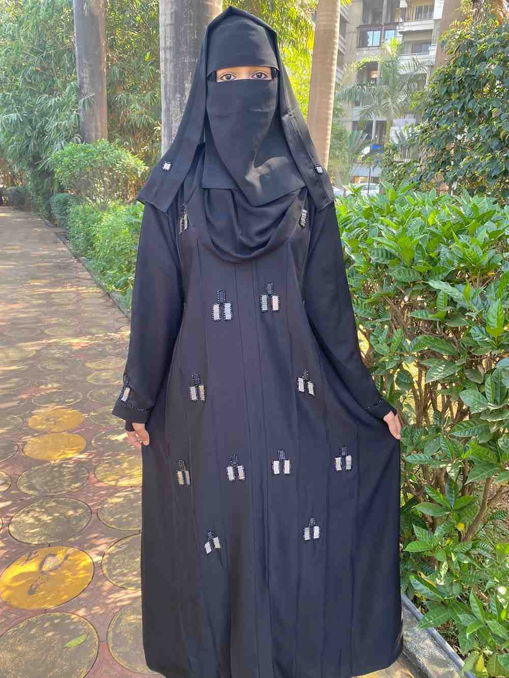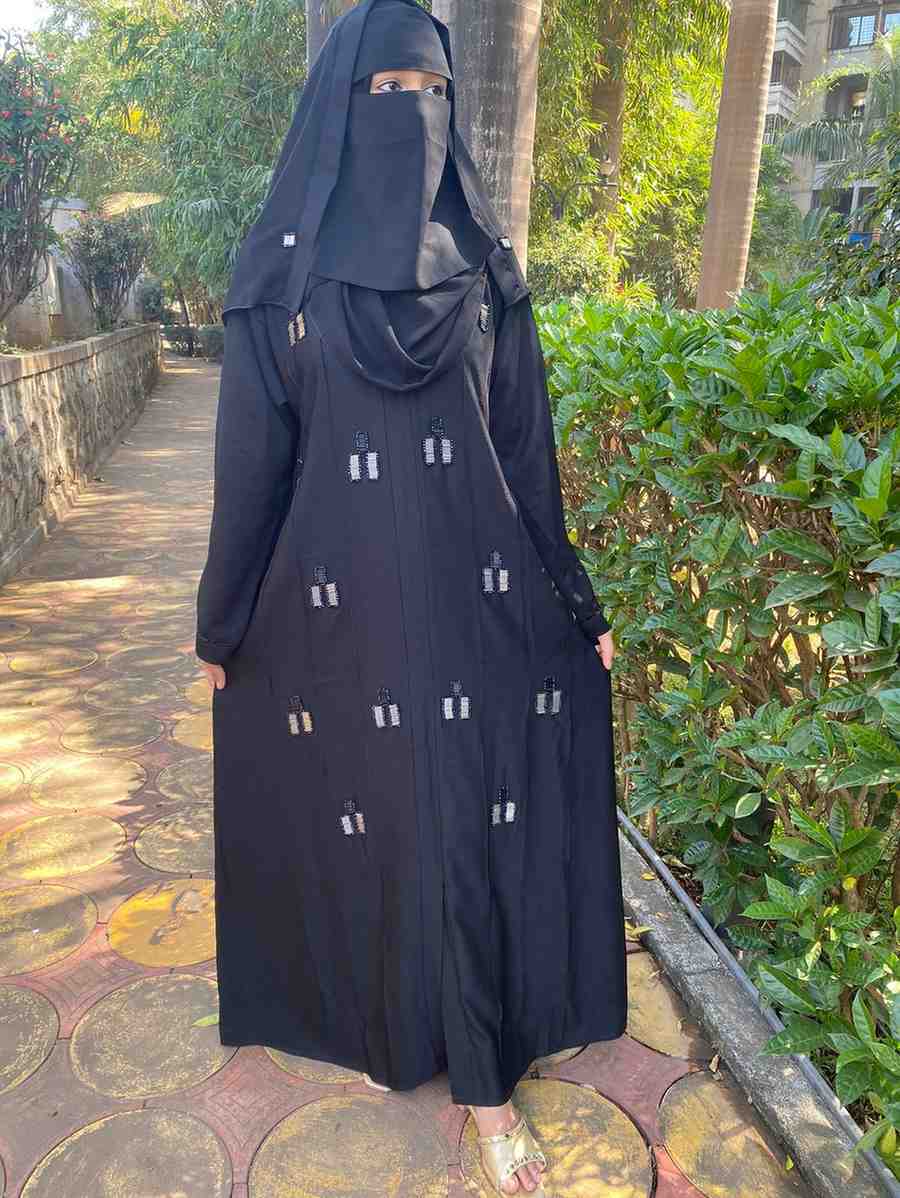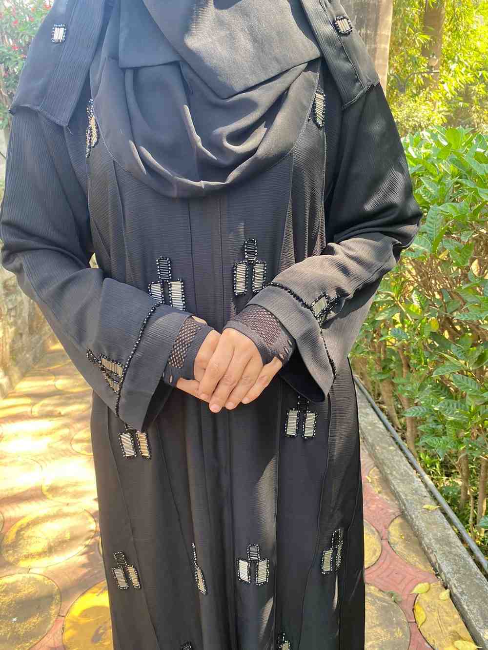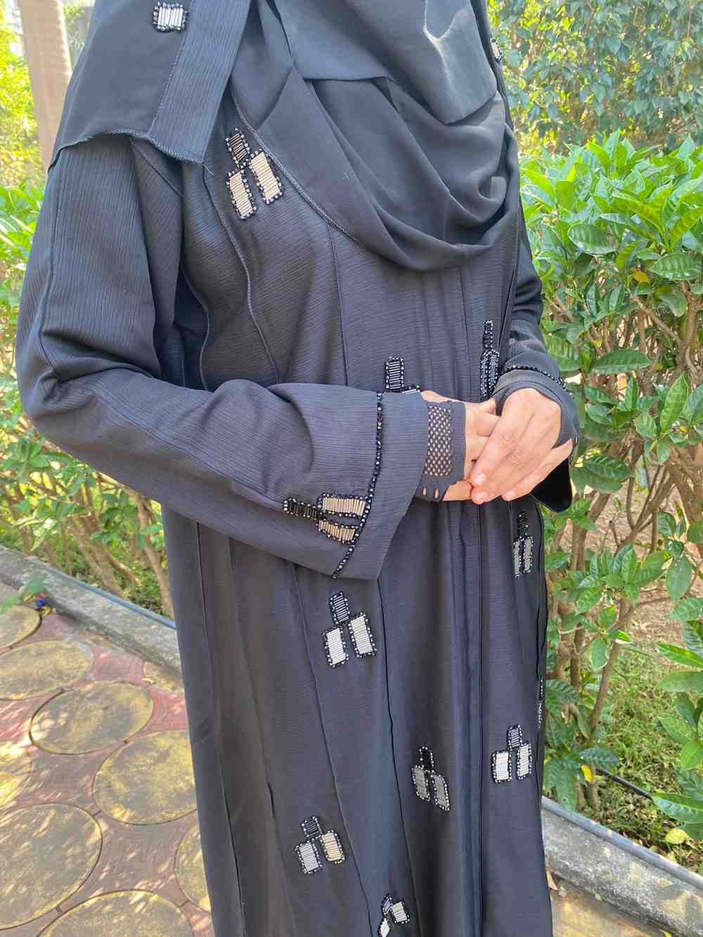 The artistry of the abaya is brought to life with the hand-applied original Japanese kat dana. These black beads are intricately filled with tikki, catching the light to reveal a discreet shimmer, reminiscent of a starlit night. The artful handwork adorns one side of the abaya, creating an asymmetrical pattern that exudes creativity and attention to detail.