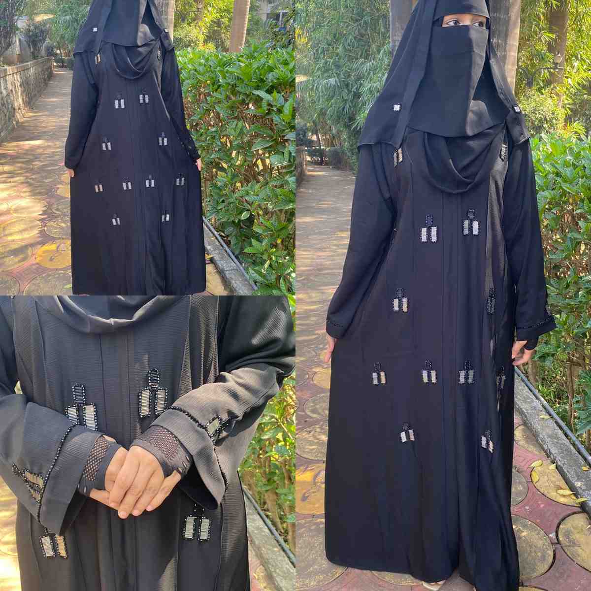 Displayed in a serene natural setting, the model brings the Glittering Leafs Abaya to life, showcasing the fluidity of the fabric and the allure of the handcrafted details. Whether it's for a special occasion or everyday elegance, this abaya is a testament to the craftsmanship and timeless beauty of Alfaiza's commitment to excellence in modest fashion.