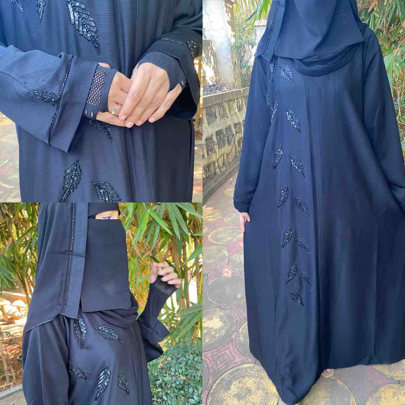 Embrace elegance with our Alfaiza Abaya, adorned with exquisite handwork and glittering leaf motifs. Crafted from luxurious Zoom fabric, this piece features ornate Japanese kat dana and tikki handwork on one side, with matching detail on the sleeves and scarf for a harmonious look.
