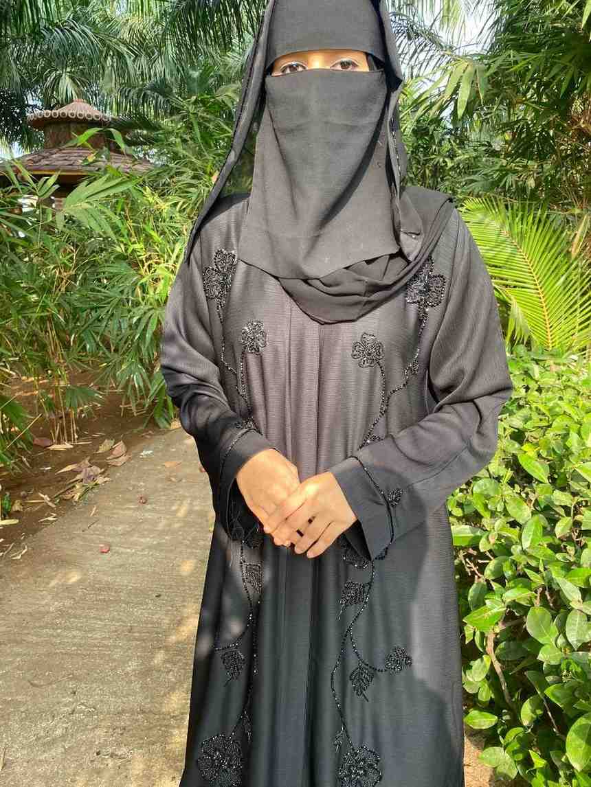 The abaya’s uniqueness lies in its detailed handwork set between pintucks, creating a textured visual appeal that is both tactile and visually engaging. The sleeves and scarf are not merely complementary pieces but integral to the abaya’s design, featuring matching silver and black Salli work that creates a cohesive and refined look. The addition of crystal outing adds a touch of glamour, catching the light and enhancing the intricate pattern.